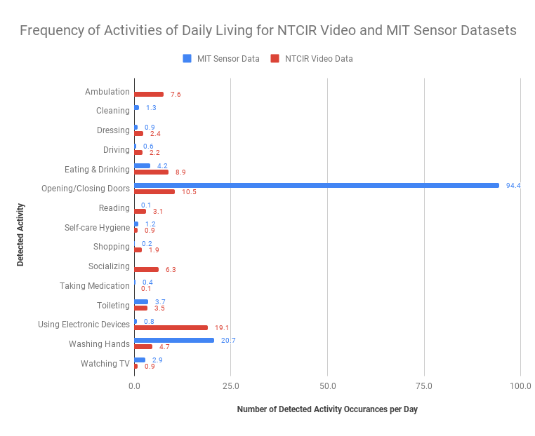 Our frequency analysis illustrates the most common daily living tasks found in the NTCIR video data (red bars) and MIT internet of things sensor data (blue bars). Some events are detected more reliably by the embedded sensors used in the MIT dataset, while others show up only in the image data. For example, sensors detect quick events more reliably than the low frame rate lifelogging video data. In contrast, the MIT sensor dataset is limited to detecting daily tasks only where sensors are placed, therefore missing events (e.g., outdoor activities) that are captured in the video data. By combining results from both datasets, we were able to obtain a more accurate quantitative measure of daily task significance.