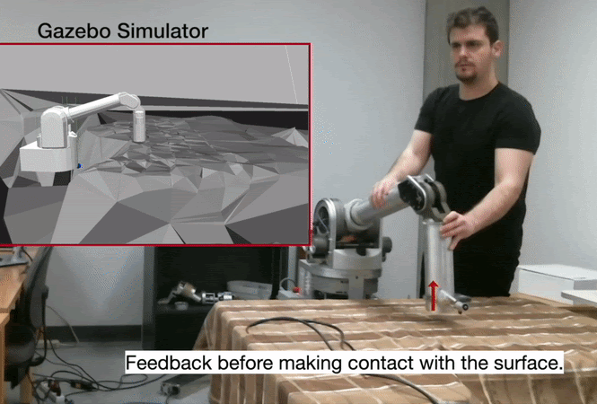 The usage of the physics simulator in our proposed system is multifaceted. We use a physics simulator not only to integrate the incremental surface mesh and the digital twin of the WAM arm robot for solving delay issues but also to improve the operator's agility and understanding of the remote scene and the follower robot state. While the interaction of the modalities provides the predictive haptic feedback, the utilization of the sensors provided by the physics simulator provides immersive predictive visuals including interaction and the follower robot state. The intermediate virtual representation gives full control of the remote environment and the follower robot by not requiring direct feedback.
